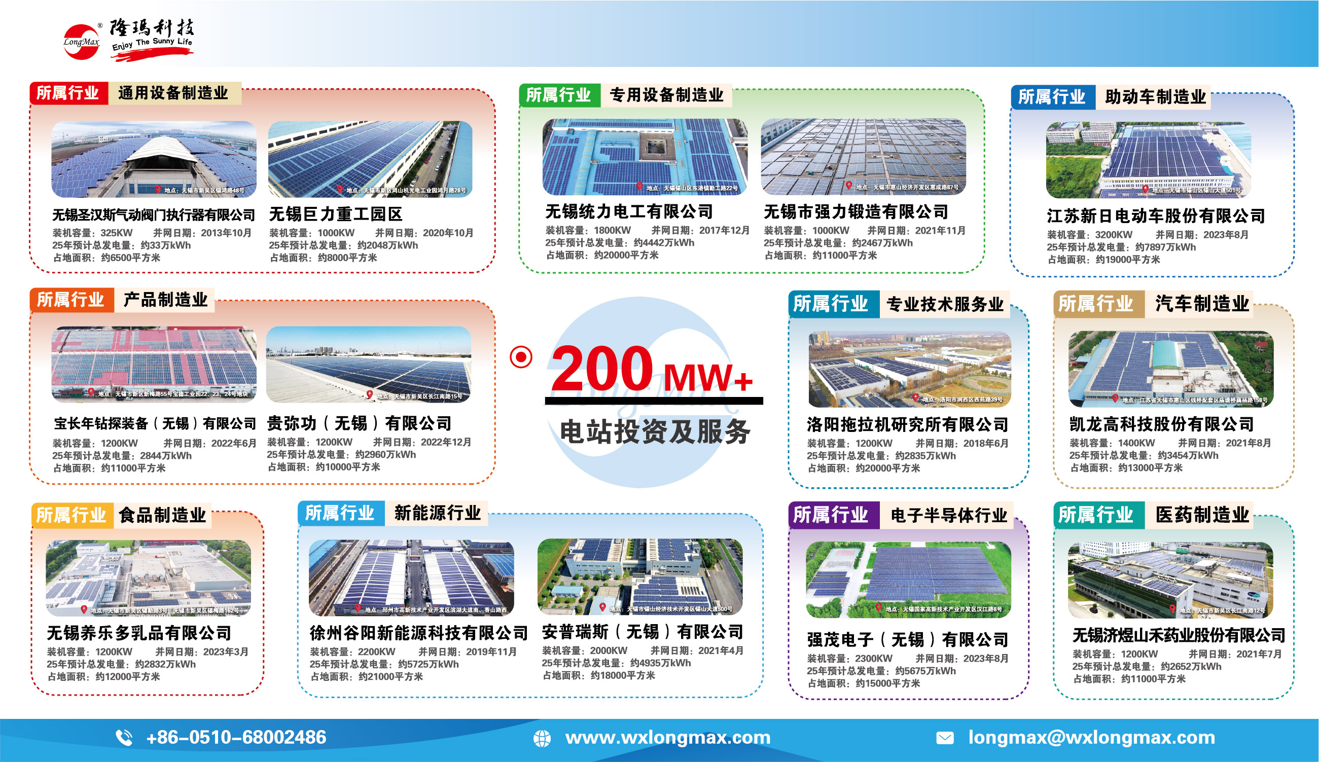 公司光伏电站累计投资建设及服务超200座,装机总容量超200MW。先后投资建设了统力电工、新日电动车、宝长年钻探装备、养乐多、安普瑞斯、强茂电子、凯龙高科、济煜山禾药业等众多屋顶光伏电站项目。
