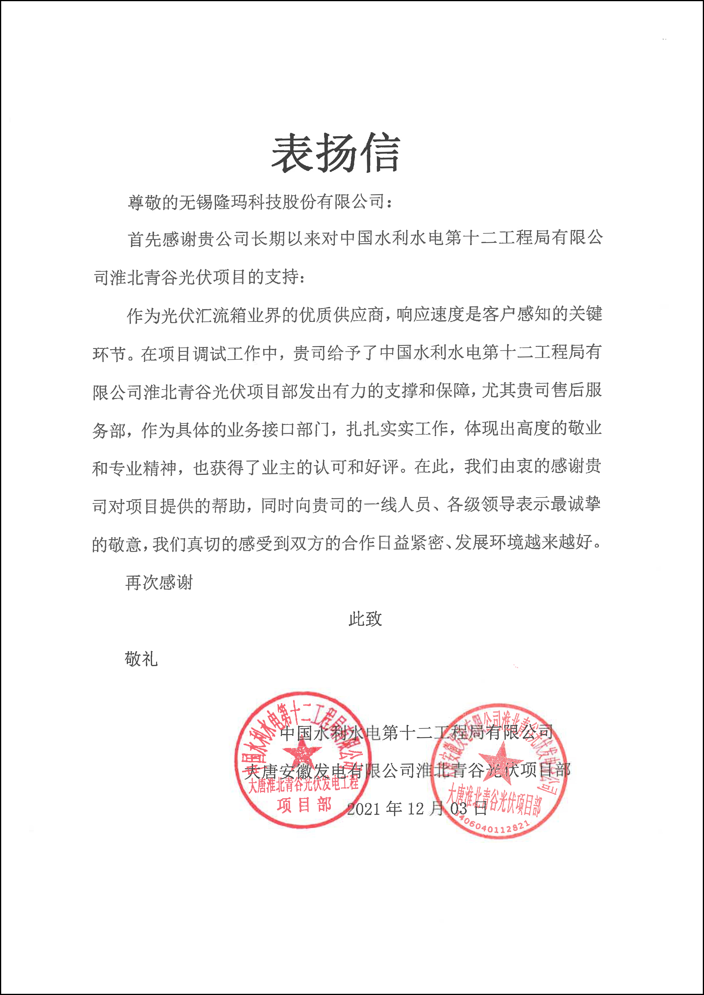 近日,我司收到了大唐淮北青谷光伏项目部的表扬信。信中对我司的汇流箱产品给予了高度评价,并对项目负责执行的工程师余得水工作尽职尽责,不辞辛苦,确保项目如期完工的工作态度进行了表扬。